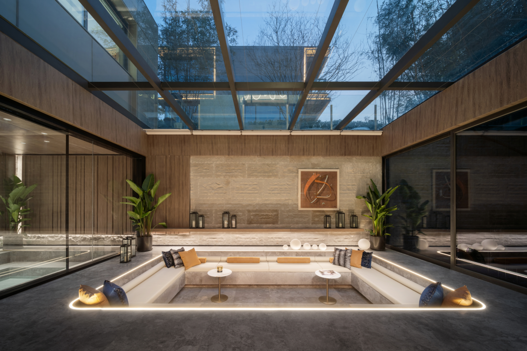 负一楼还设置有可仰望星空的谈心坑,以及恒温泡池。透过玻璃天窗举目远眺,与自然亲密融合,居家即可享受一份自由和惬意。