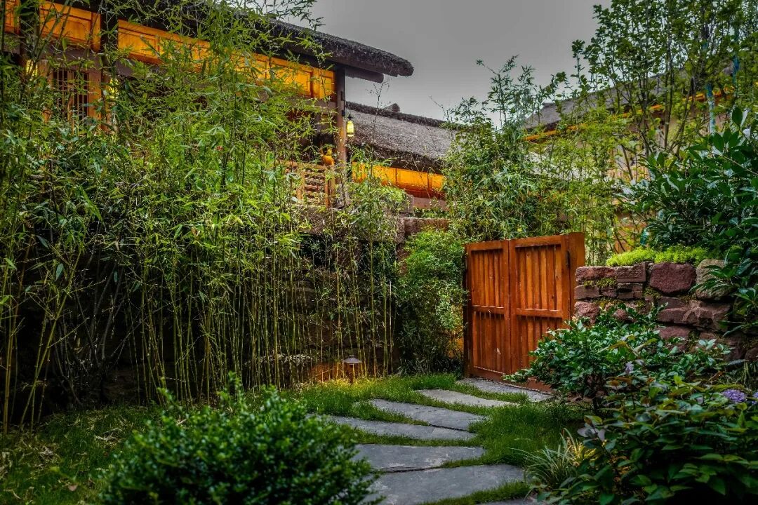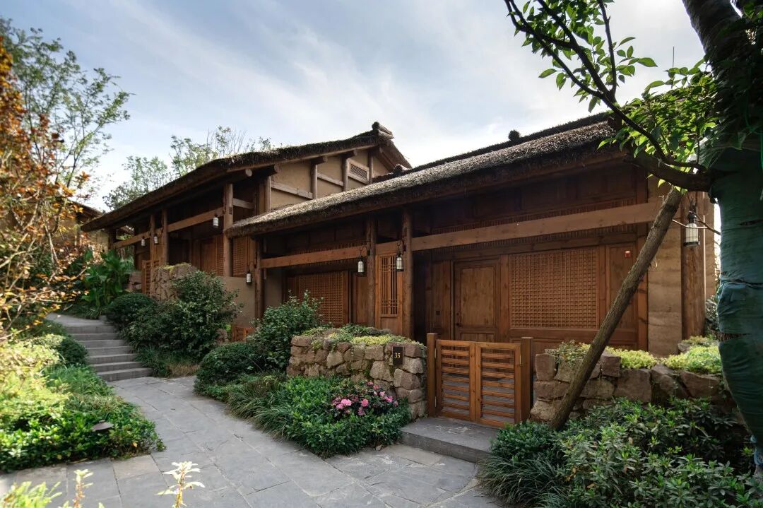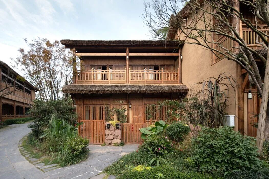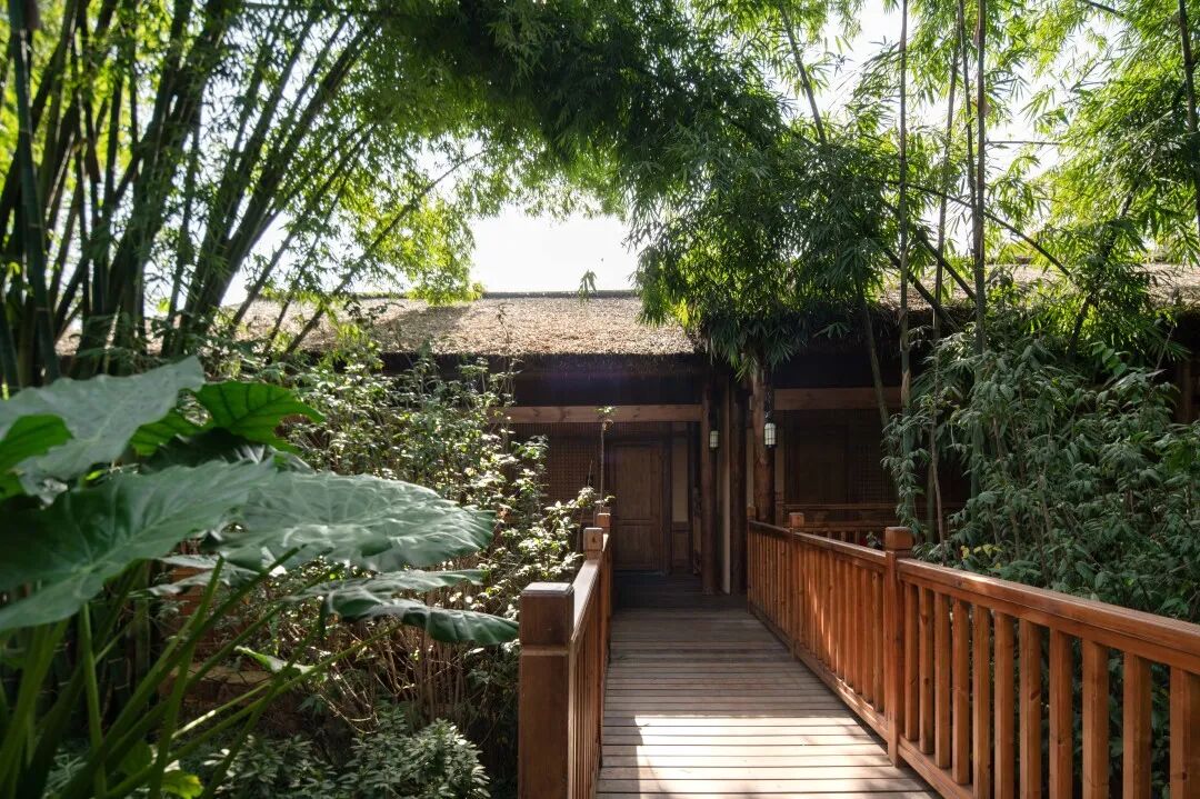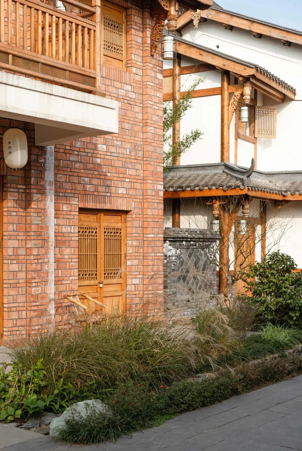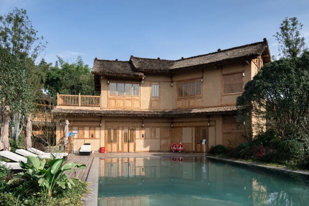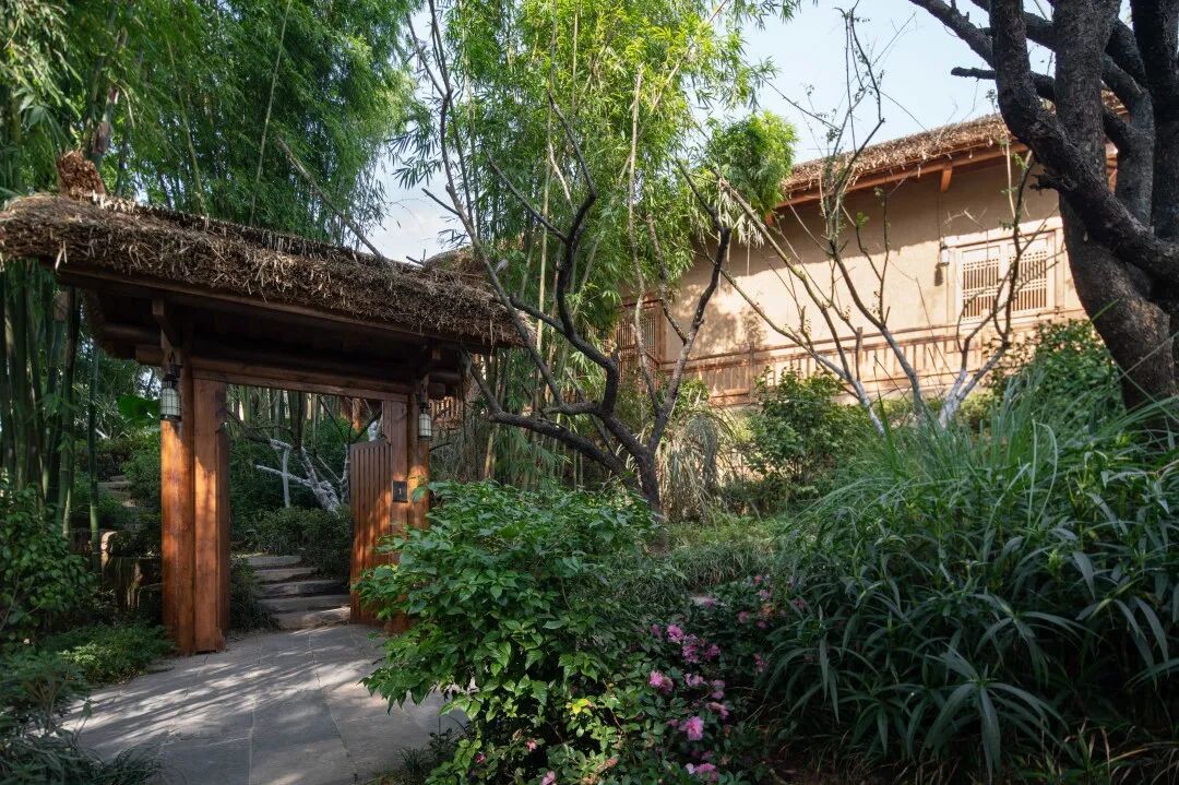 集市旁的安麓酒店聚落,则再现了一种杜甫草堂式的林盘园艺之美。在茅草屋顶与夯土墙的复刻中,华泰众城适当选择了一些复合材料,既保留了早期川西民居的风格形式,也满足了现代建筑安全与实用的需要。