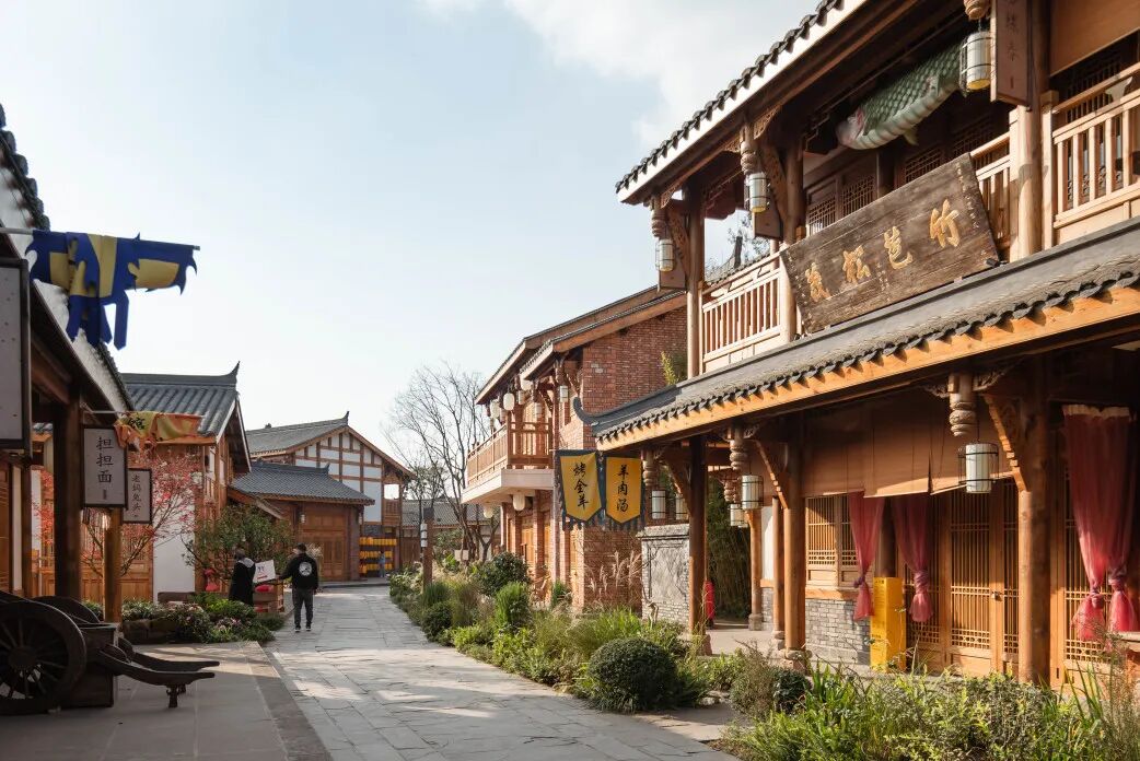 茅草屋、木质穿斗结构的小青瓦平房、红砖楼,在华泰众城的设计中,这些代表着不同时代的建筑形态与房前屋后的景观和谐交融,将整个场景营造为“小聚居、大散居”的三处林盘聚落,透着平和淡雅之气。