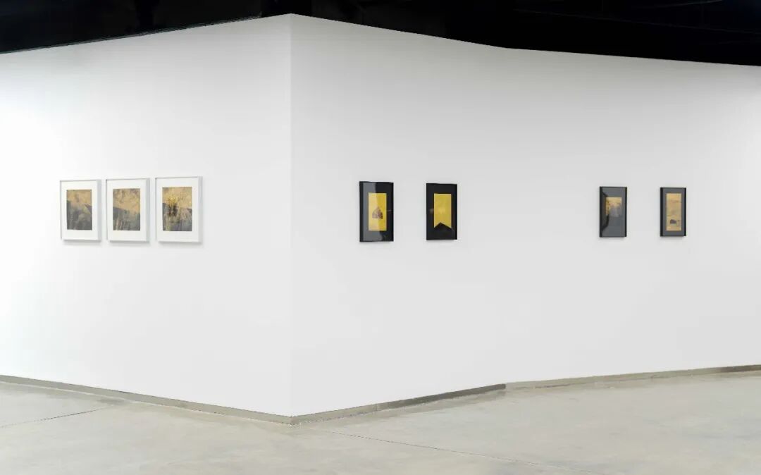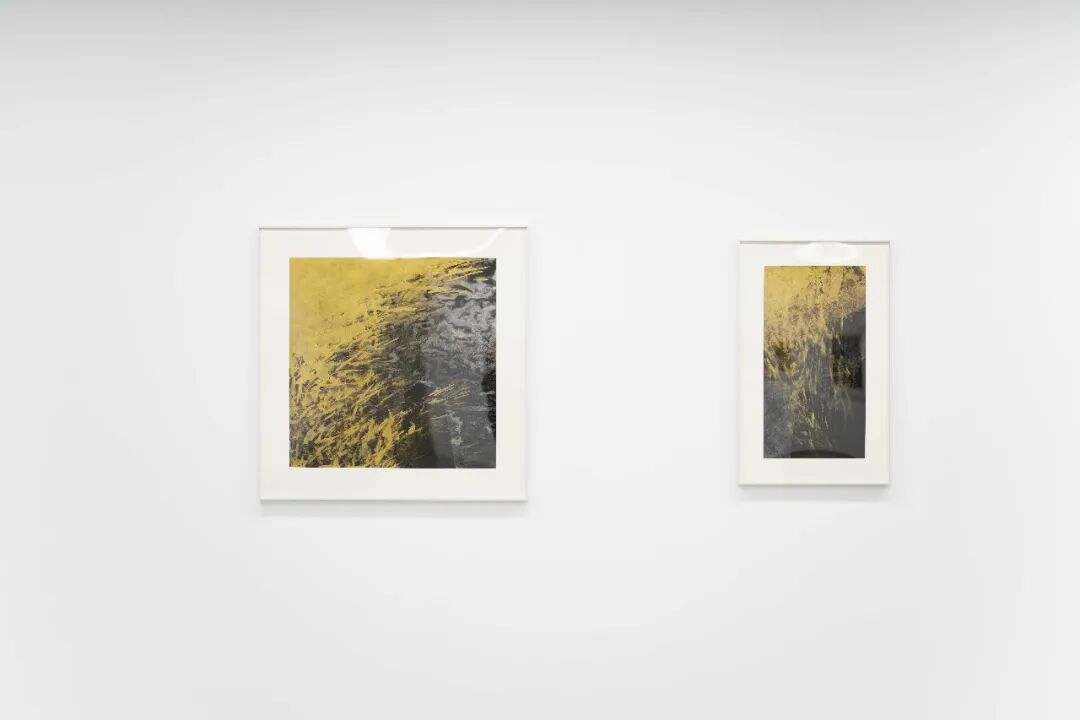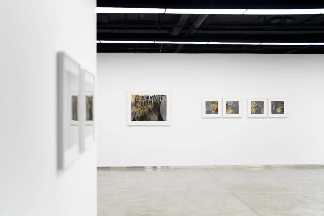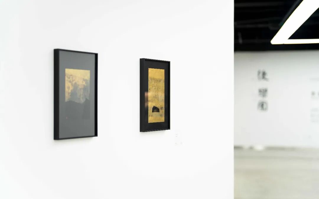 “使用了压、印、拓、染等诸多形式,也使用‘综合媒材’的方式以‘控制墨色与金色的交融’来制造肌理。同时我还使用了不同种类的墨汁与金色颜料,用上加工处理的宣纸,形成各种带有纹路的基底,再应用类似传统绘画中‘裱褙’的装裱手法进行创作。”