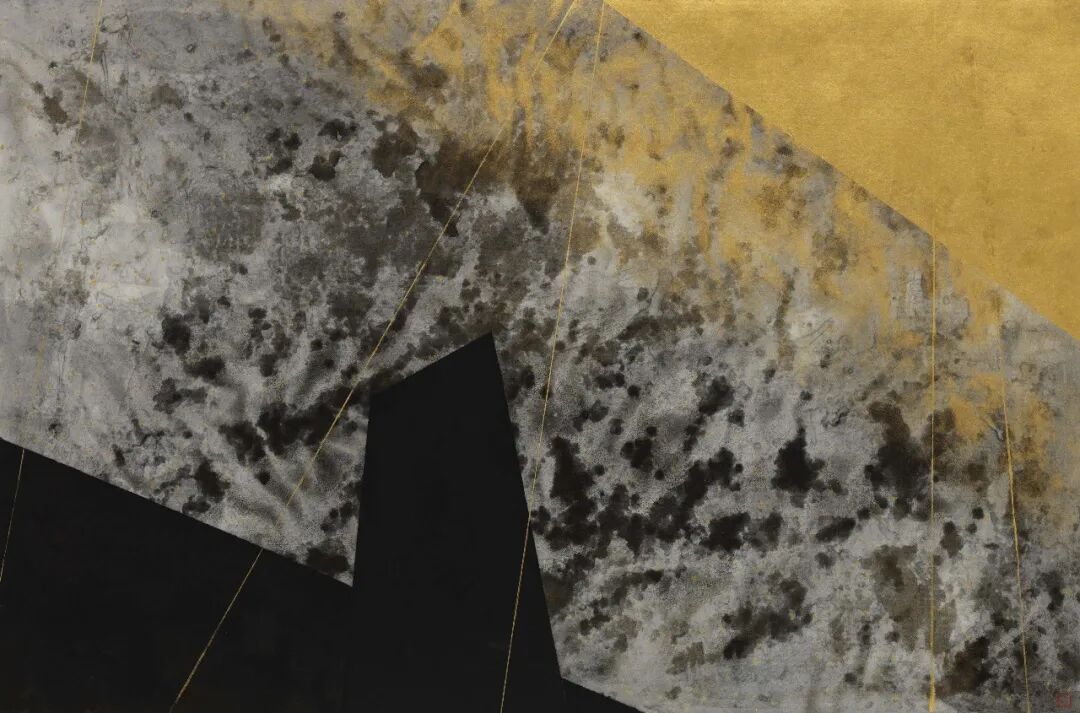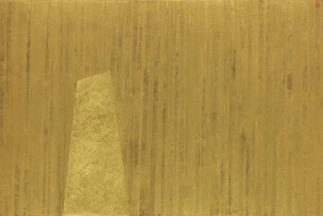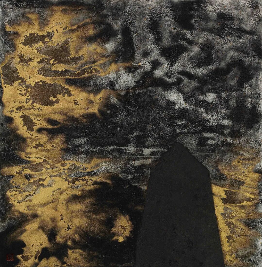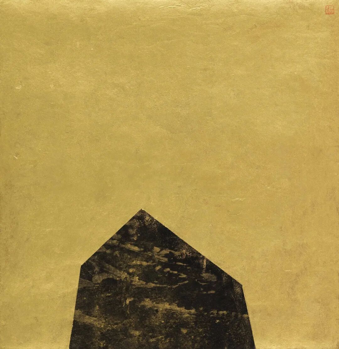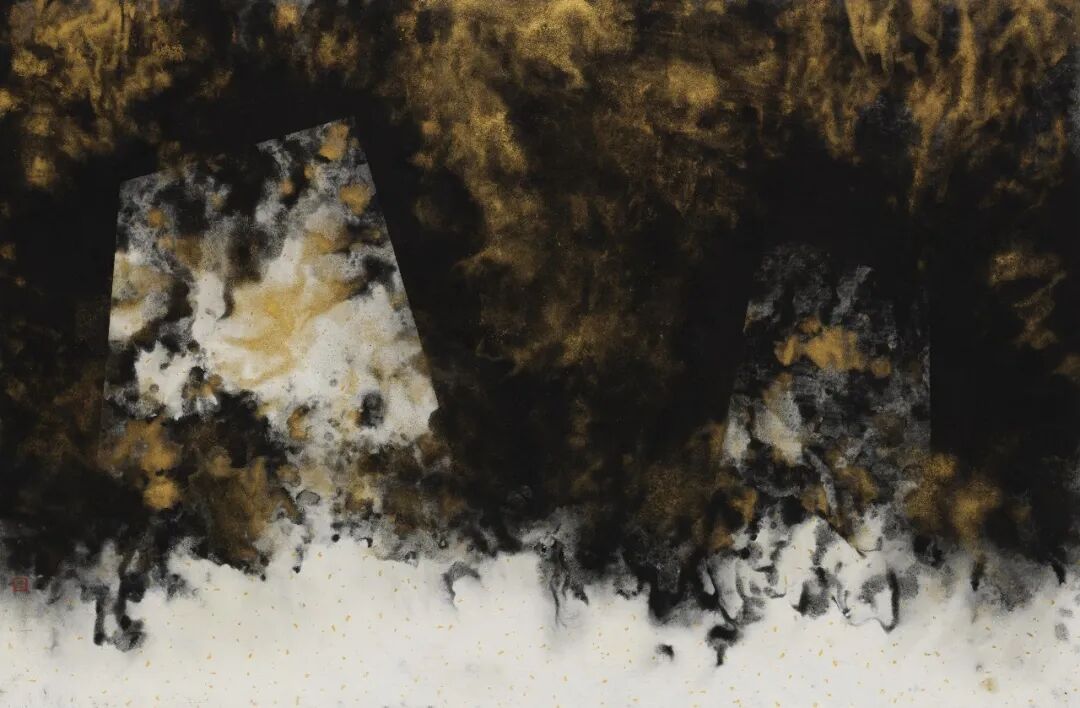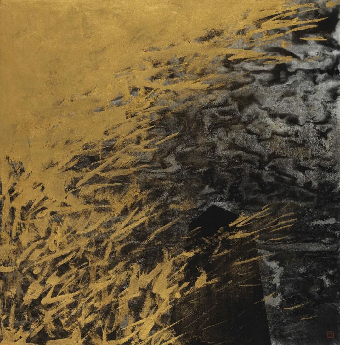 他在这组系列中加重、加深了金色的运用,所以仅仅观赏金色所幻化出的不同肌理也让人意犹未尽。虽然是水墨,但第一眼看上去,巧妙的处理让画面具有很强的物质感,甚至呈现金属板被腐蚀、雕琢的触感。