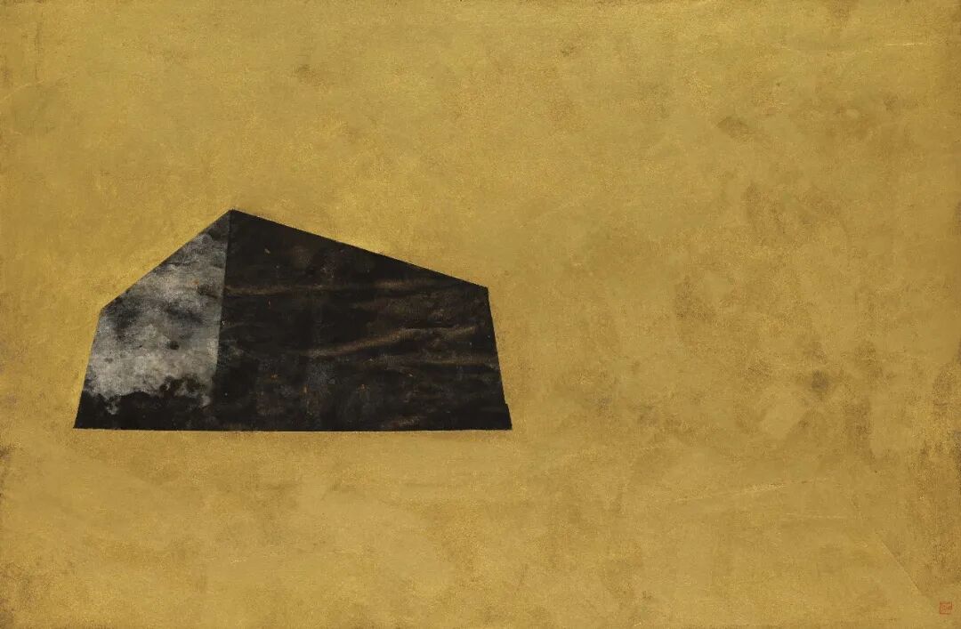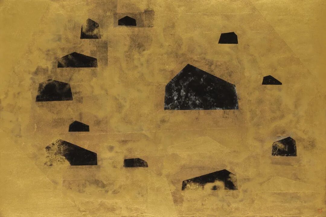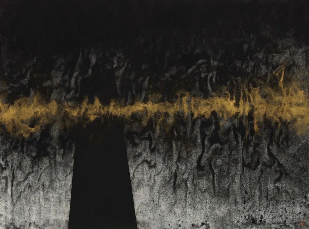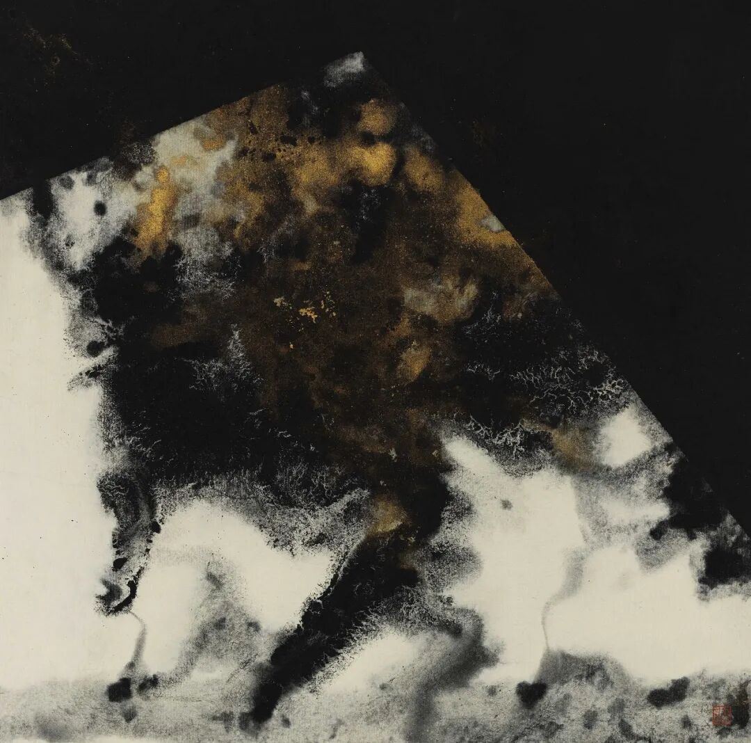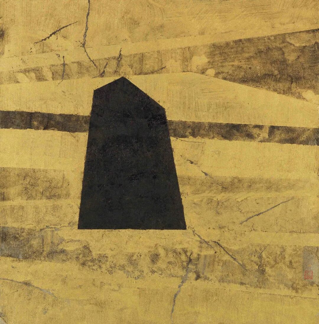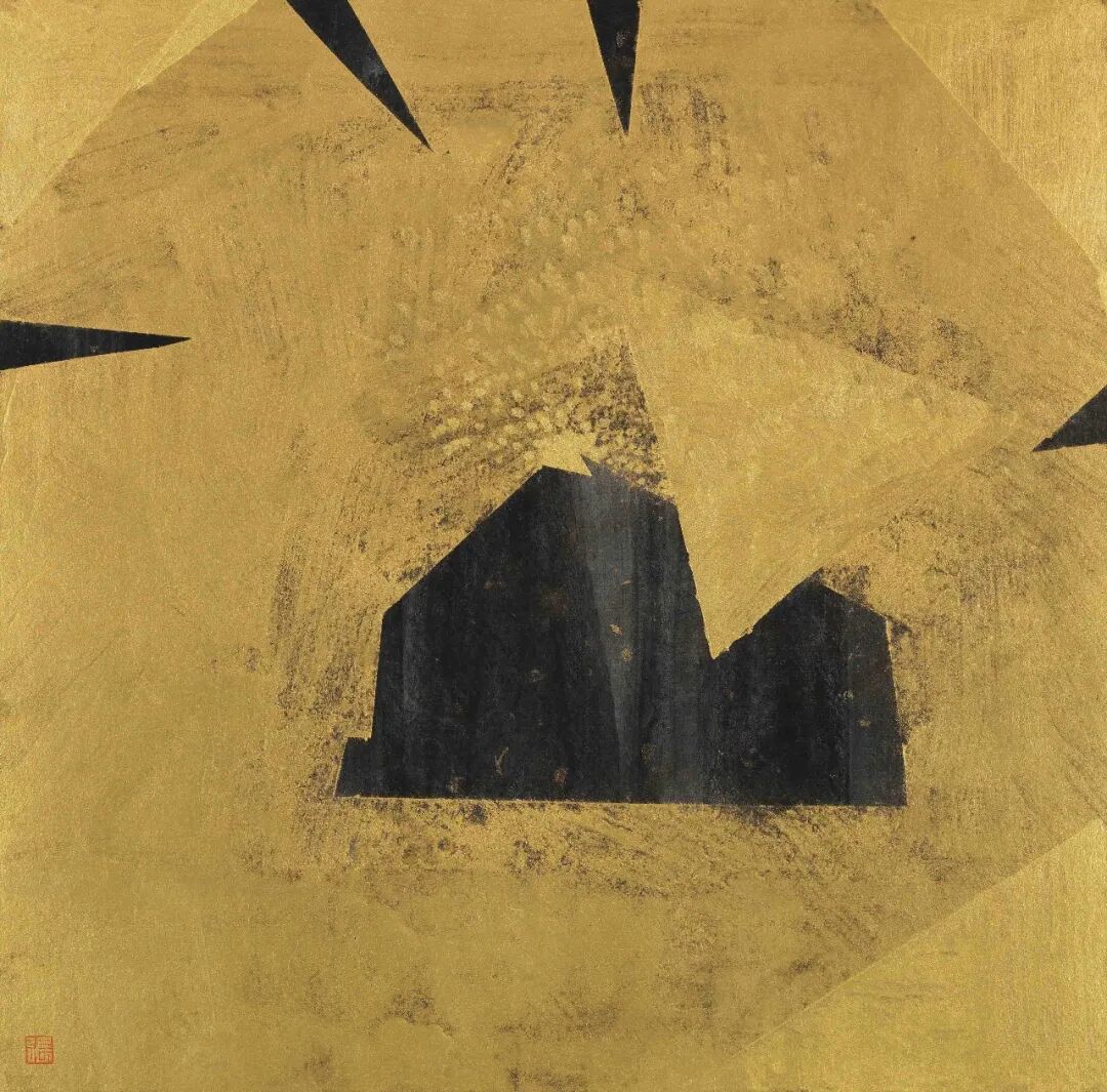 他在这组系列中加重、加深了金色的运用,所以仅仅观赏金色所幻化出的不同肌理也让人意犹未尽。虽然是水墨,但第一眼看上去,巧妙的处理让画面具有很强的物质感,甚至呈现金属板被腐蚀、雕琢的触感。