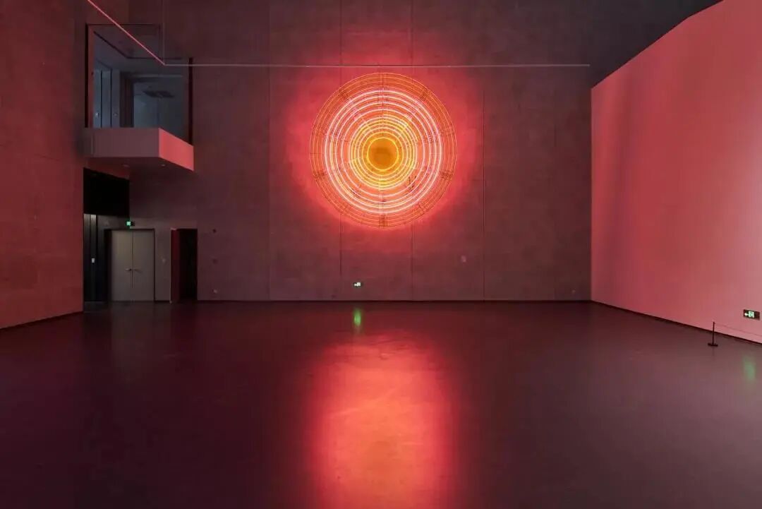 这件《十进制时钟(鲑鱼红和诺维亚金)》是一个“功能性时钟”——110个霓虹灯环代表了一个完整的白天和黑夜,它们分成10个小时,100分钟和100秒,每11个环代表一个小时,分与秒则都是由里至外,从最小的环开始计算相加。艺术展品似乎成为一个“时间之灯”,让观者穿梭在现实与想象之间,给成都观众一次特别的观展体验。