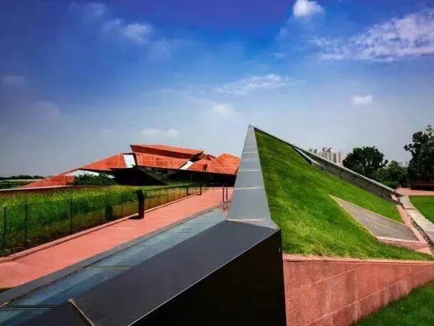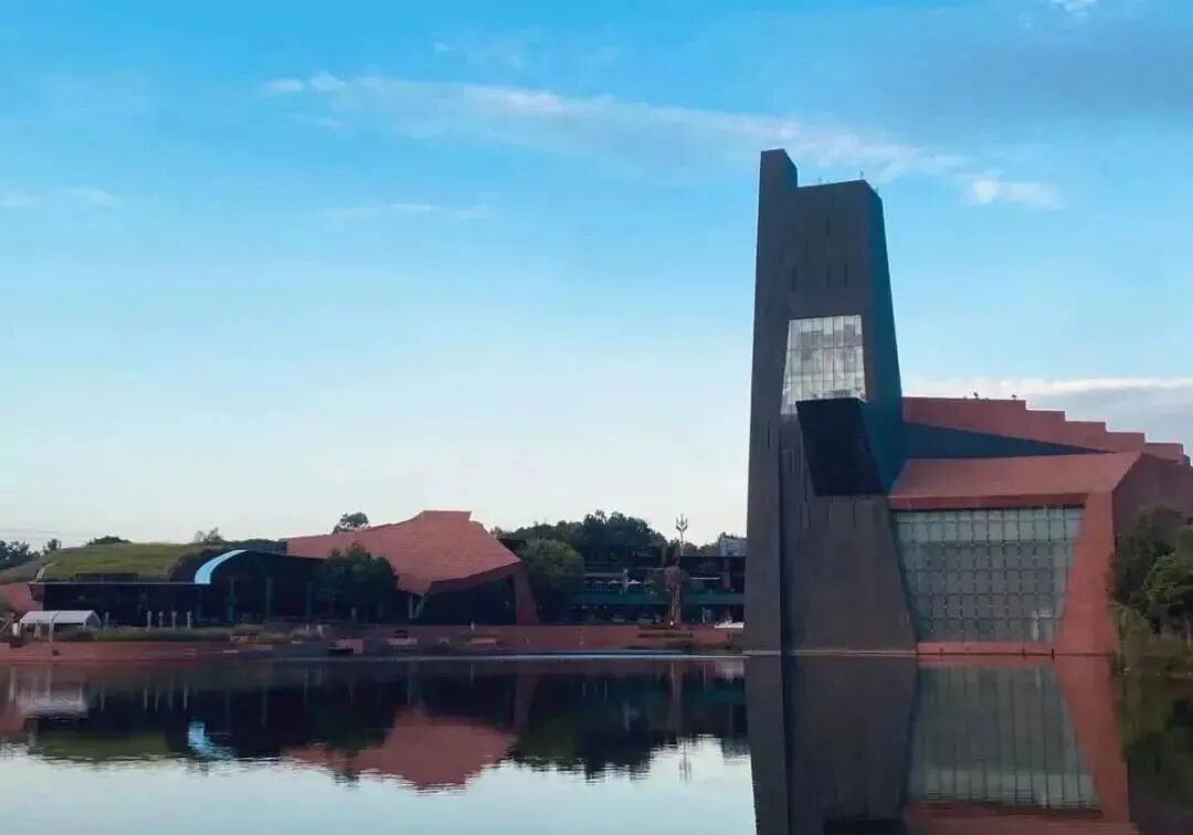 水上剧场所在的麓湖艺展中心由大地建筑之父安托内·普雷多克(Antonie Predock)担纲设计,设计根植于麓湖生态城的红砂岩地貌,充满原生力量的线条和切面使建筑呈现粗犷而自然的美感,仿佛定格了巨石炸裂的瞬间。
