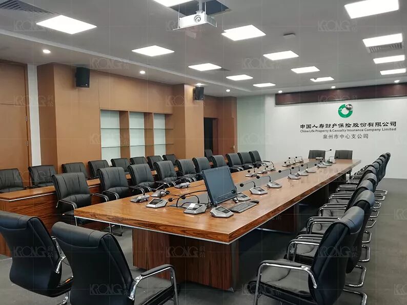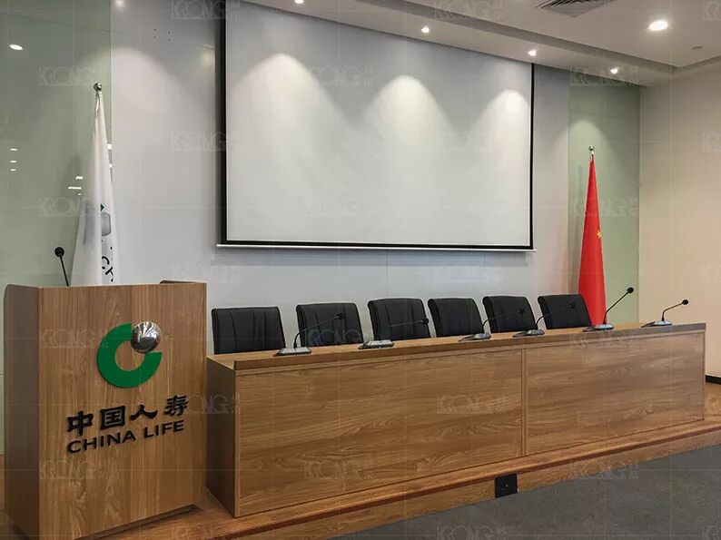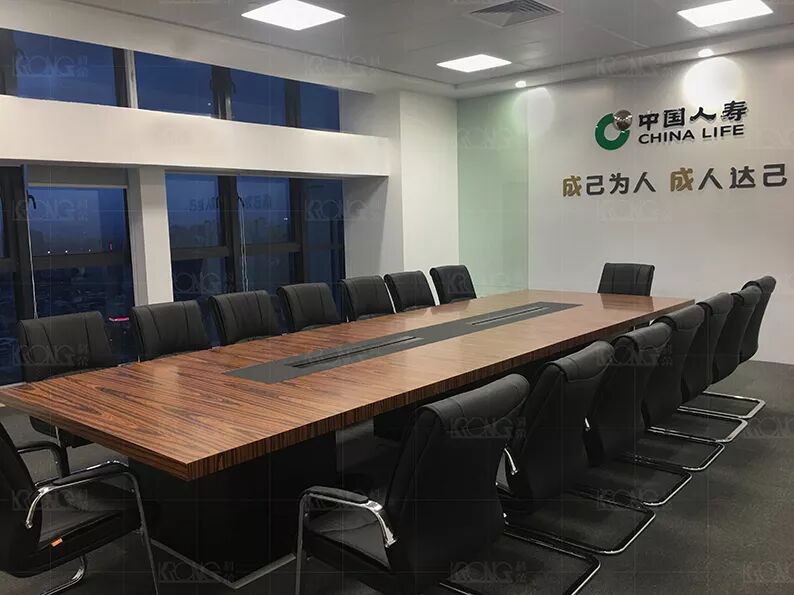 会议室延续培训空间的严肃氛围。原木桌面搭配黑色皮料的品尚会议桌,提升空间的品质感。独特的党支部会议室反映了人寿公司紧跟党的步伐,坚持“与时俱进,争创一流”的企业精神。