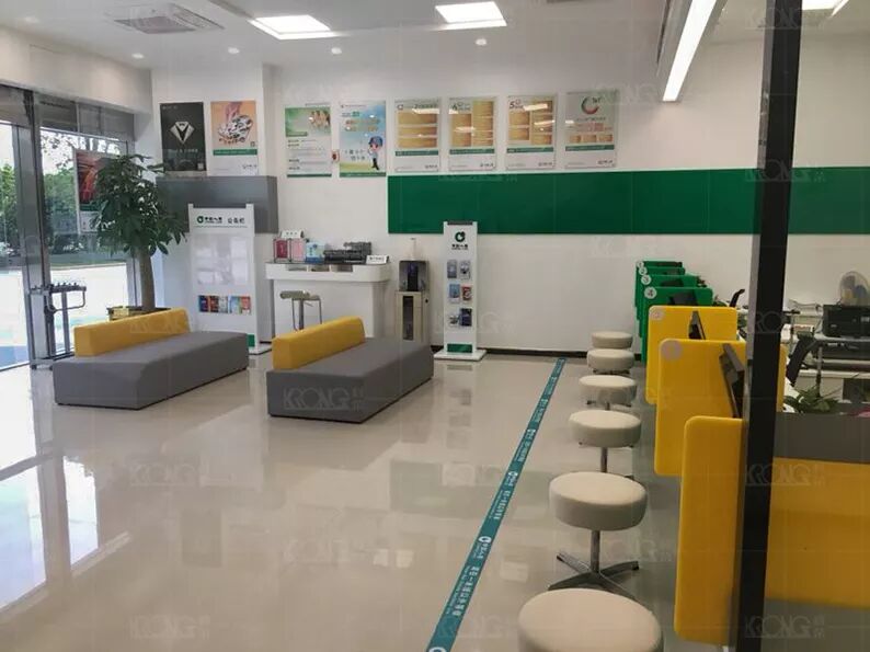 大厅简约质朴的一楼事物大厅采用纯色瓷砖地面搭配简约几何沙发及业务椅,利用色彩的变化,构建出一个极具功能性的前台、等候空间以及业务空间。满足大厅业务的日常使用,也反映出中国人寿公司拼搏务实的价值观。