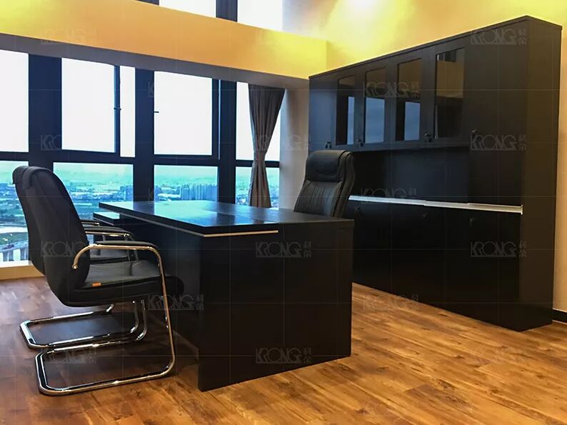 总经理办公室延续木板与黑色的基调,增加皮料与金属材质,塑造简约商务的办公环境。