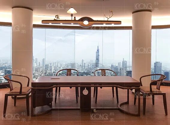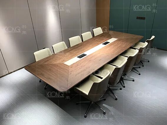 会议室为其搭配品尚会议桌,木纹桌面搭配素色皮质的分割区域,搭配桌面多功能插座,集品质与科技与一身,满足会议需求。