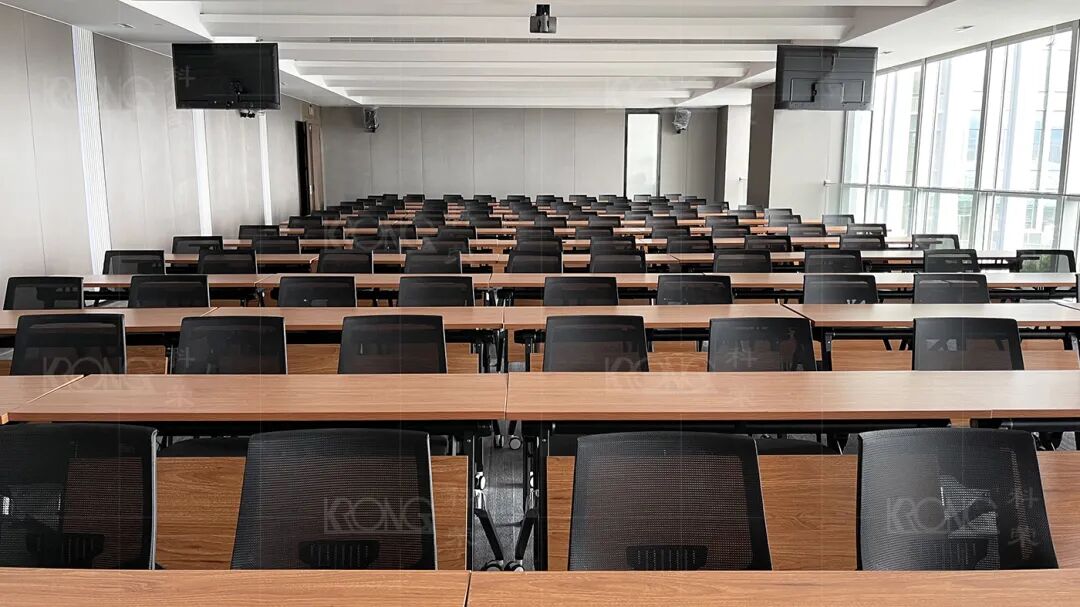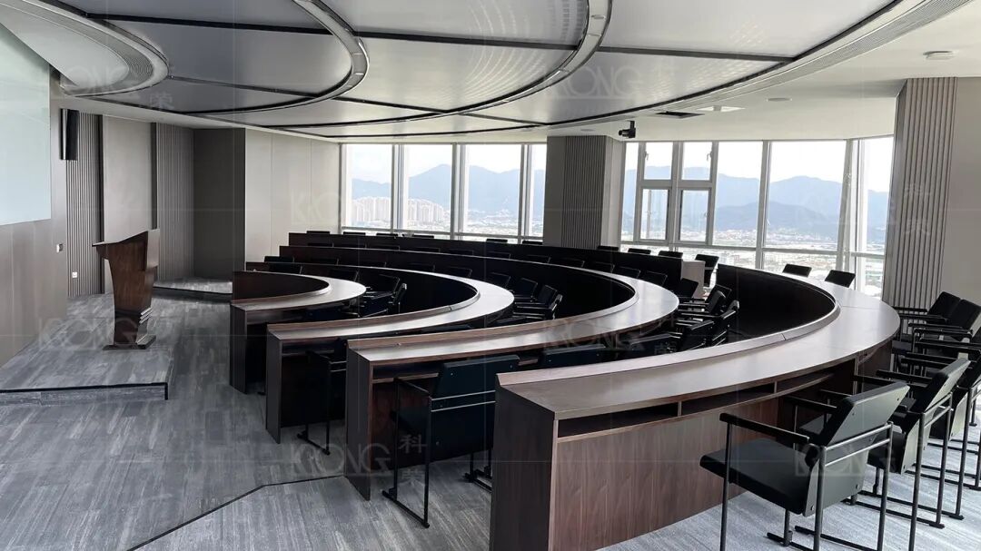 深色木纹的弧形会议桌,搭配活动主席台。满足演讲、培训的使用需求。