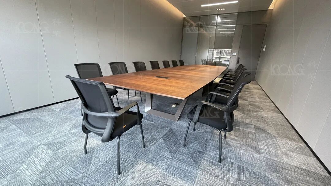 铸铁脚架搭配直条木纹桌面,造型简洁干练,搭配轻便的网椅子,方便员工日常的会议需求。