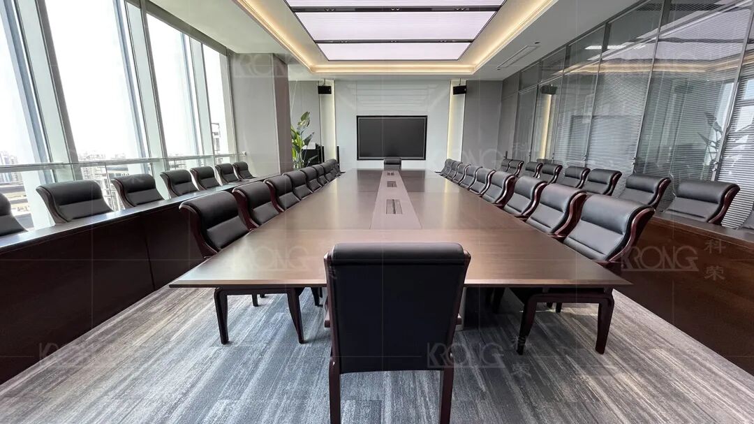 霸气庄严的实木长会议桌,用于高管会议。搭配的实木座椅,皮质靠背,稳重感十足。
