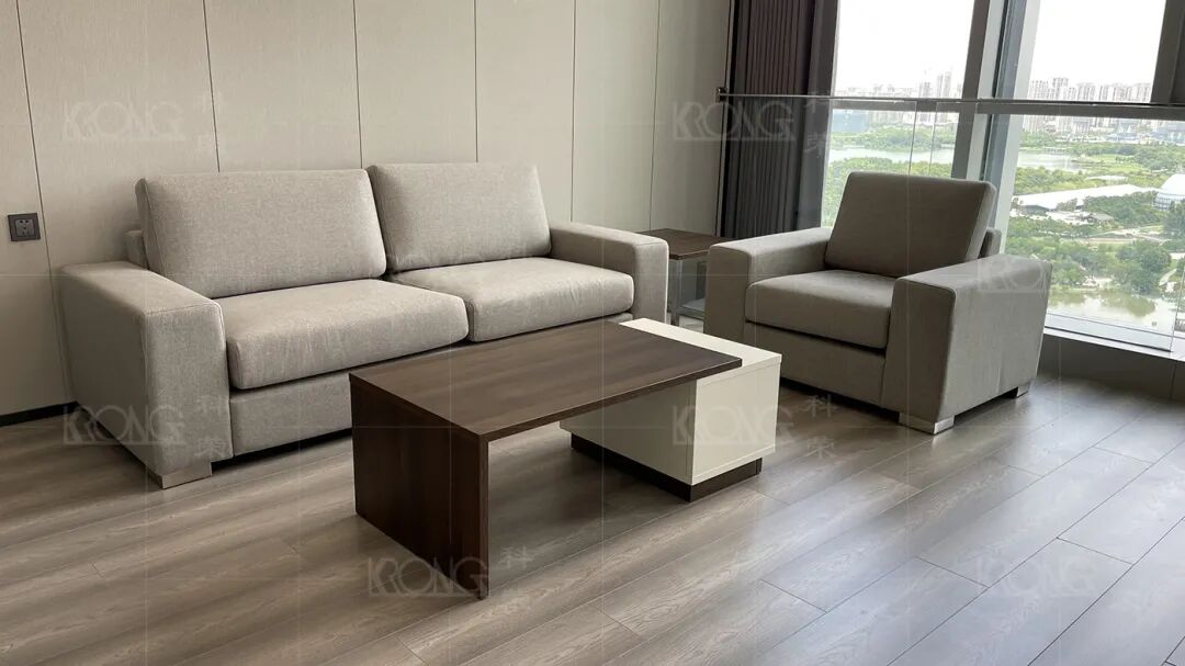 商务风格的金刚沙发和茶几放置于前台左侧。前台右侧的菱竟沙发系列与锦簇茶几搭配,将户外的美景尽收眼底。整个空间,商务与休闲风格交相呼应,相得益彰。