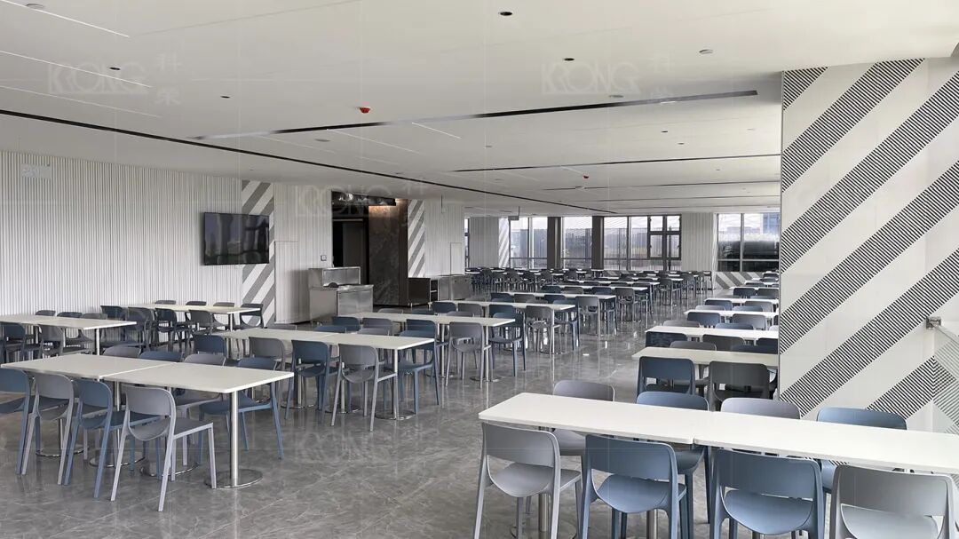 员工餐厅选用蓝灰配色的美思餐椅,搭配暖白的迅嘉直条餐桌。给人清爽舒适的视觉感受。一体成型的塑料椅和白色桌面,易于清洗,方便维护。