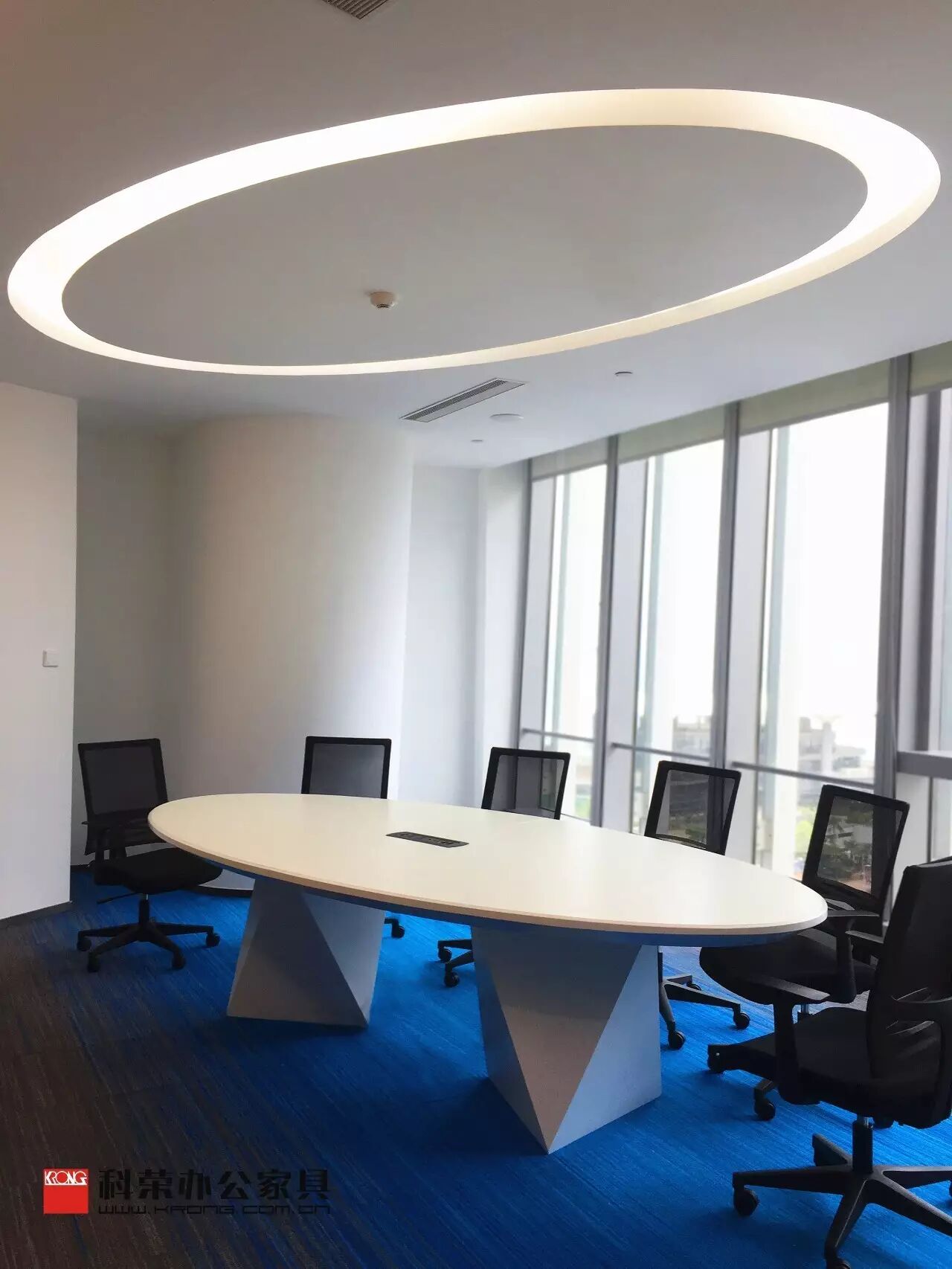 为呼应天花造型椭圆形元素,订制为椭圆形桌面,增添空间趣味性,同时平衡空间感。