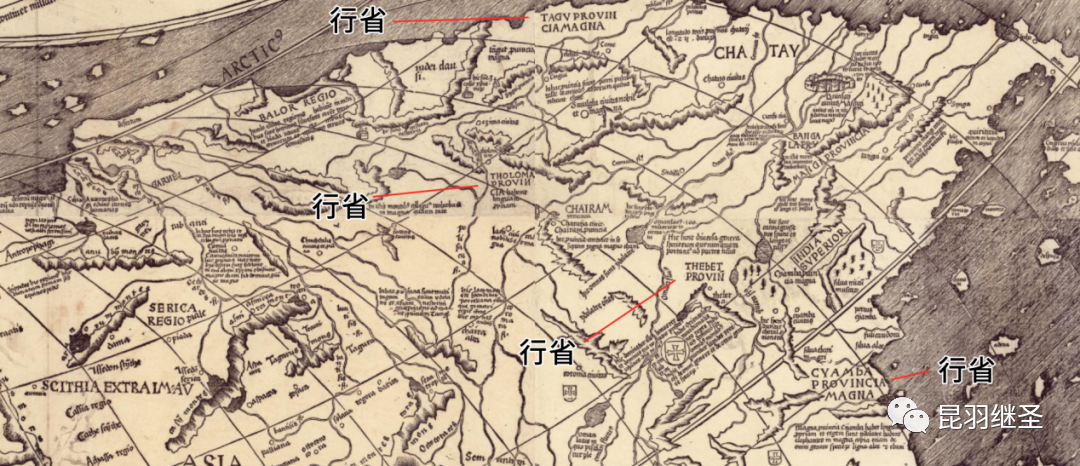 为什么这么说呢?因为,所有的西方地图在誊抄地理信息时,只有中国、只有中国、只有中国才有“行省(PROVINCIA)”,而其他的西方地图,任何一个地方、任何一个国家,都没有类与中国类同的“行省(PROVINCIA)”标注。
