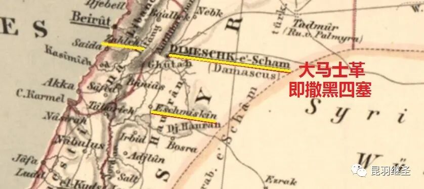 大马士革下面紧挨也勤尕思城(即本图中的Eschmiskin)。耶路撒冷在也勤尕思城下面。大马士革左面为哈利迷城(Zahleh)。