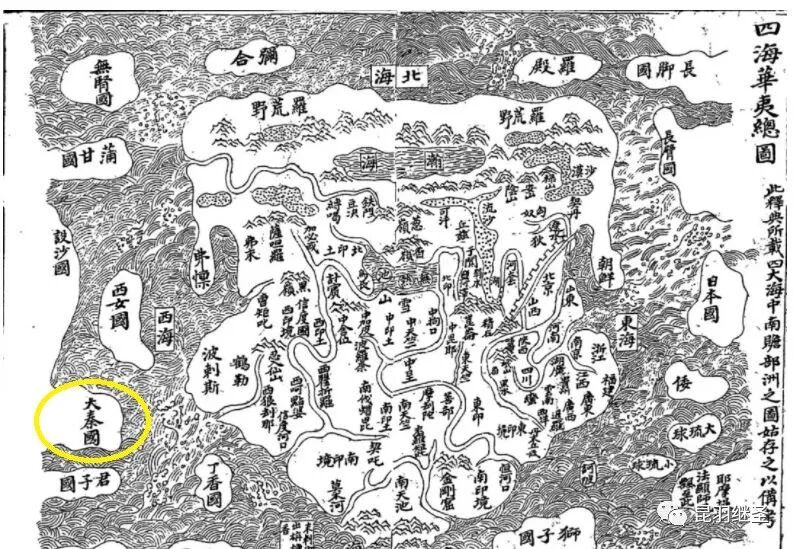 明代章潢《图书编》(1562—1577)卷二十九和《三才图会》都收录了一幅《四海华夷总图》,图中西边有大秦。