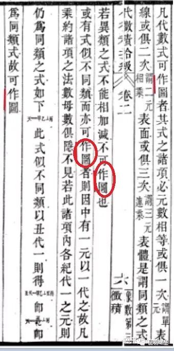 上图中,李善兰《代微积拾级》与罗密士版本对应的文字部分,与罗密士版本显然是逐字逐句对照翻译的。但是上图中没有出现任何“几何”的文字,而是“作图”二字(红圈部分)。而在罗密士版本中,显然把李善兰的“作图”都直接翻译成“geometry”或“geometrical”了。