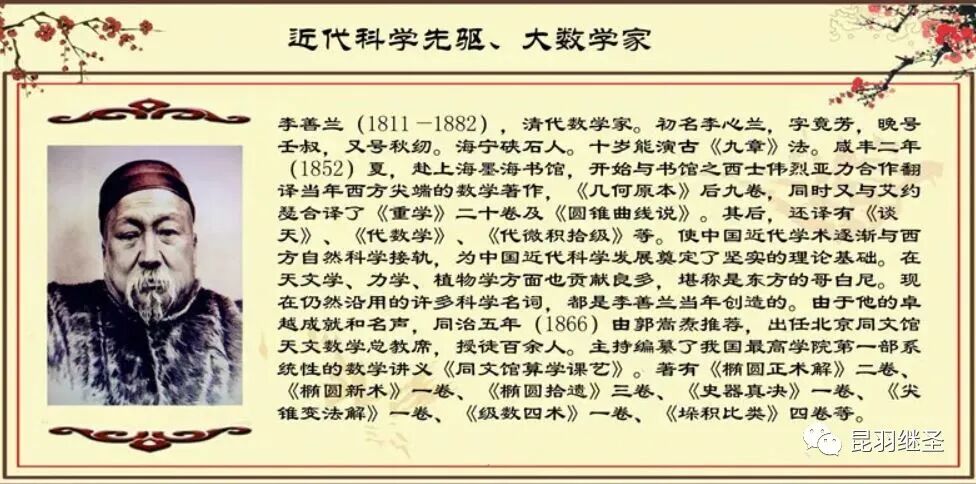 李善兰是继梅文鼎之后清代数学史上的杰出代表,是中国19世纪著名的数学家、天文学家、力学家和植物学家。其创立了二次平方根的幂级数展开式,各种三角函数、反三角函数和对数函数的幂级数展开式。