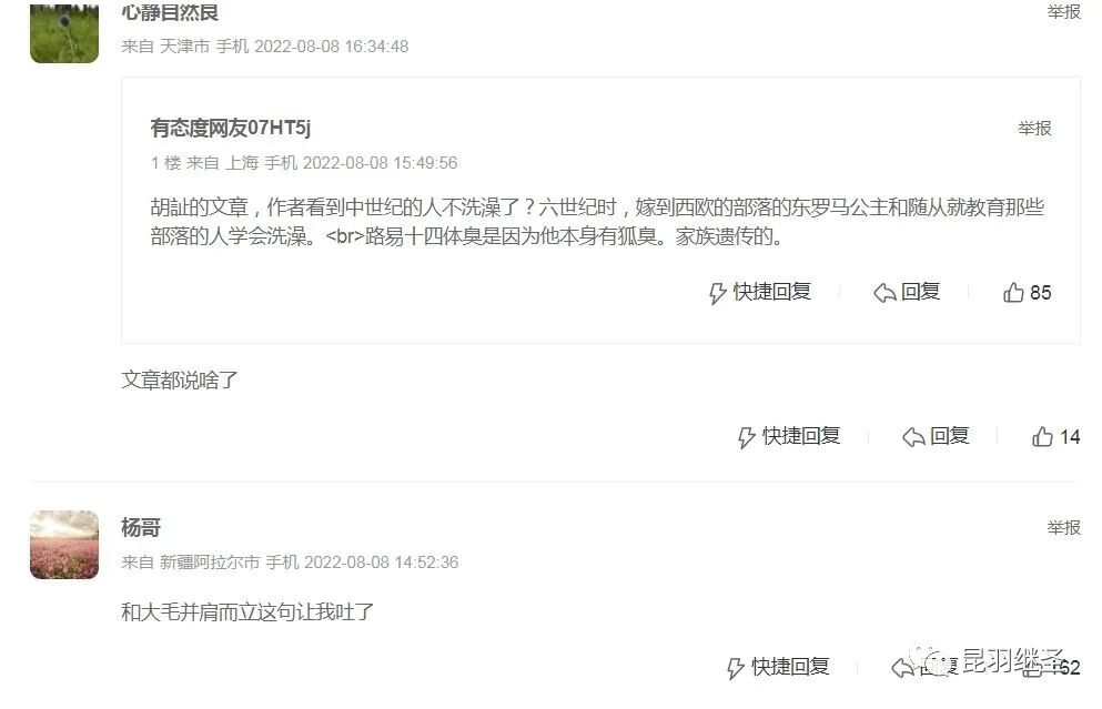 “胡扯的文章,作者看到中世纪的人不洗澡了?六世纪时,嫁到西欧部落的东罗马公主和随从就教育那个部落的人学会洗澡。路易十四体臭是因为他本身有狐臭。家族遗传的”(教会一不允许,二是习俗,三是洗澡费柴费水,肥皂还很昂贵,平民都买不起,文中所说全部有据可查。把路易十四体臭归结为狐臭,请问证据在哪儿?经常在国外奔波的人,对于“体味”这点肯定不会陌生);