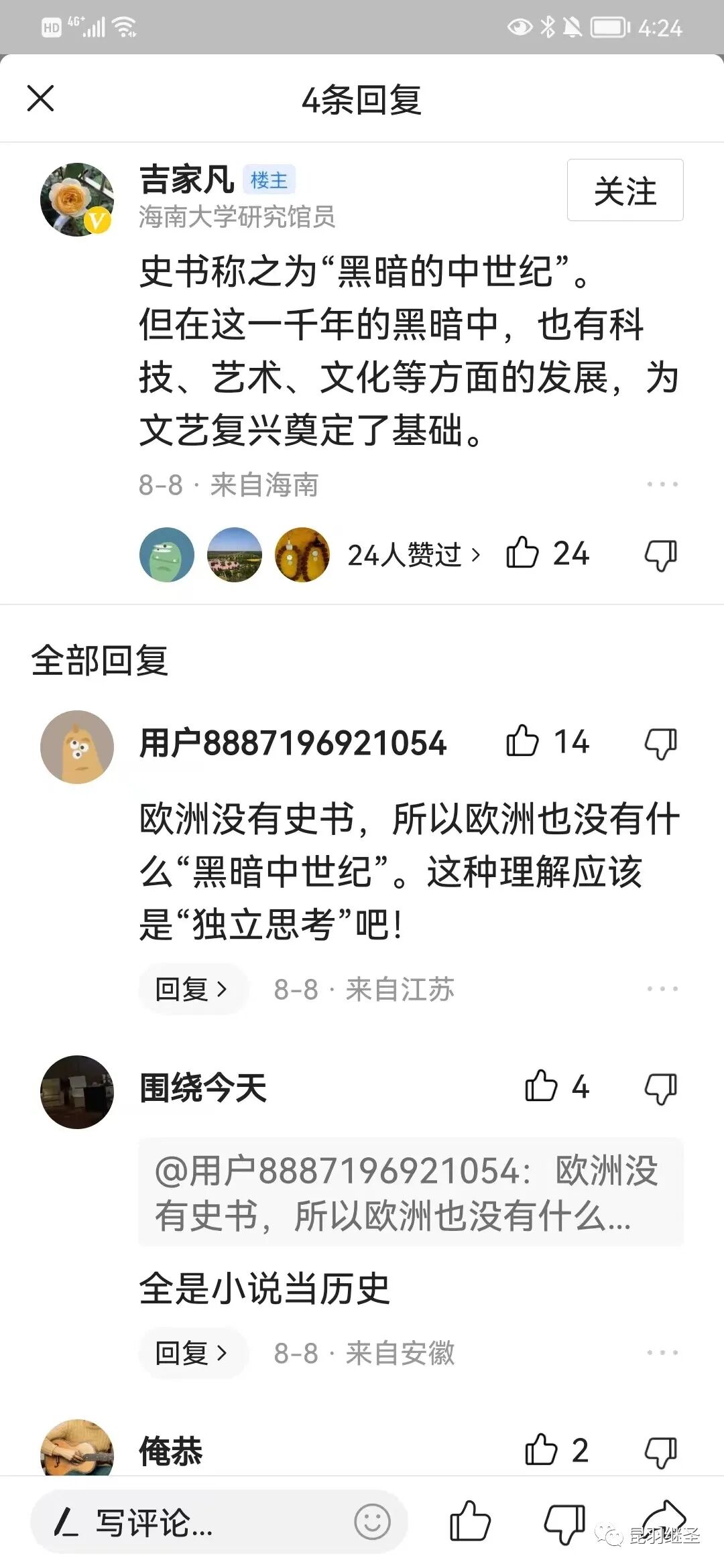 这里,突然出来一个认证为海南大学研究馆员的吉某某,主动为西方辩解。结果,群众纷纷留言,表示意见向左。