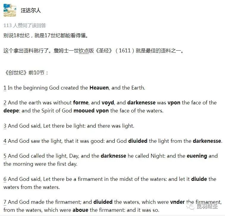有人不服,表示反对,并声称17世纪的都能看得懂,还贴出了1611年詹姆斯一世钦点版的《耶经》。可惜,他拿错的所谓证据却恰恰漏了陷儿,——英国第一本英语词典《约翰逊词典》是1755年才出版的,单词4.5万个,与康熙词典中的词汇一一对应不说,数量还相等,在此之前,连词典都没有,书面语言也未形成,请问这詹姆斯一世钦点的《耶经》是拿什么编出来的?