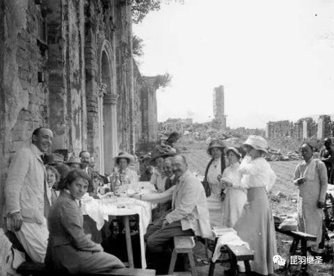 清朝末年,每到周末或假日,西洋楼总会吸引一些西方人到此野游聚餐,刘阳收藏的其中一张照片就反映了当时一群西洋人在海晏堂北面聚餐的景象。