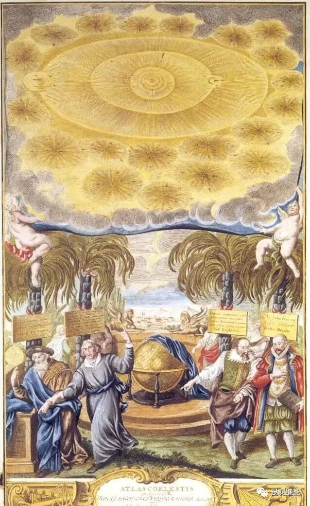 而这本星图的封面就是上文提及特意向托勒密(崇祯历书中的多禄某)、哥白尼、开普勒和第谷四人致敬的那幅图。