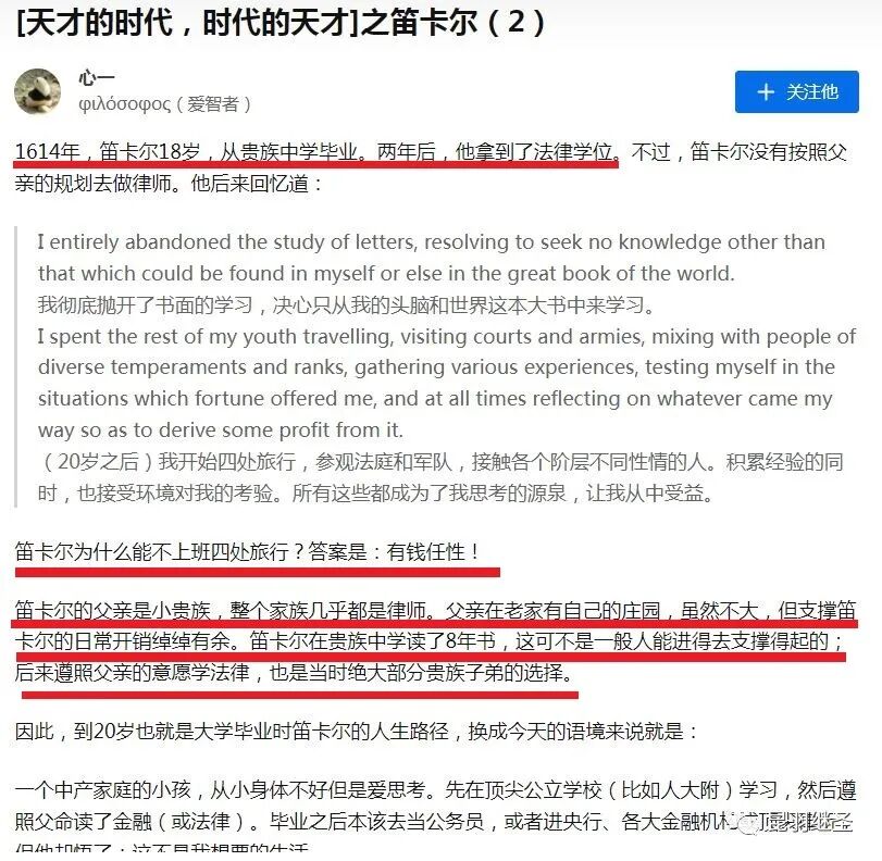 科学网某作者转载的一篇文章,笛卡尔既上免费的耶稣会学校-尖塔中学,家庭经济富裕,囊满无挂,优哉游哉。