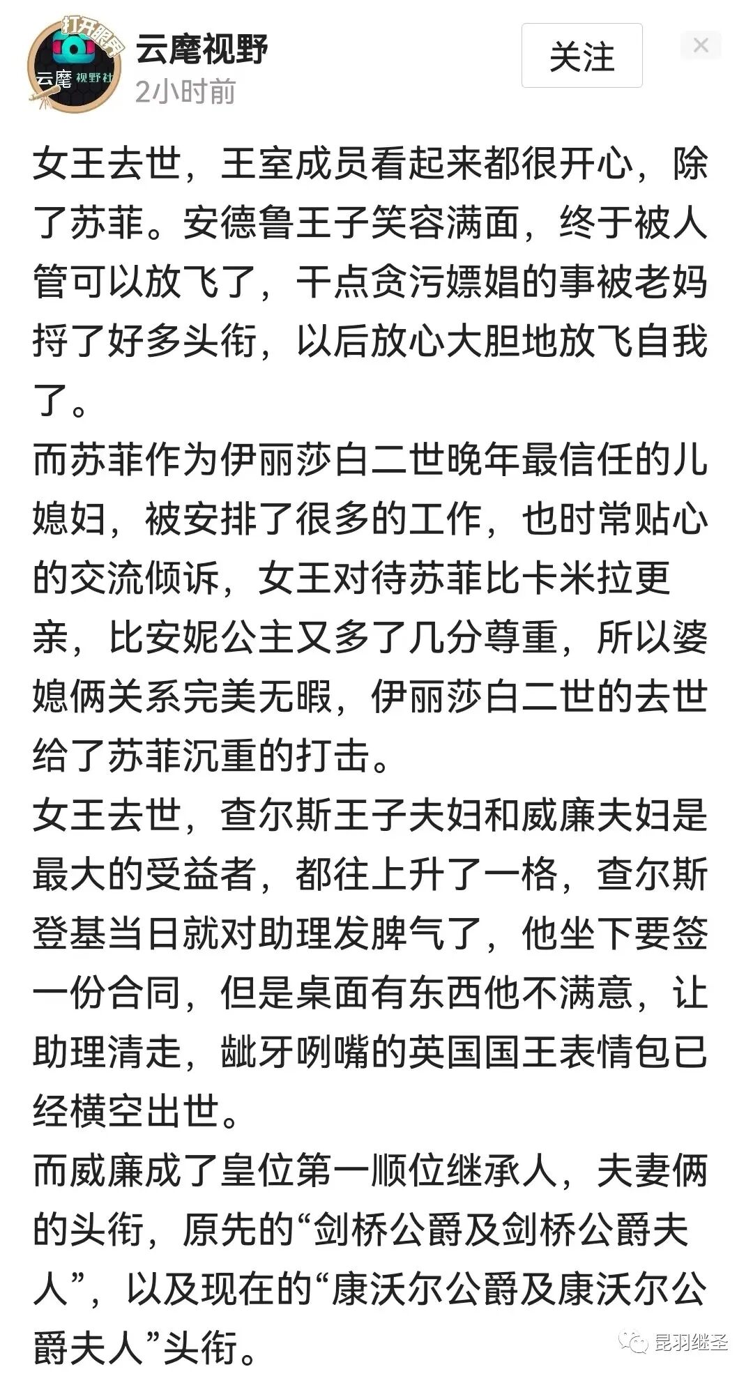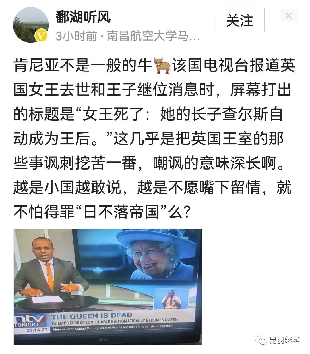 据说,肯尼亚电视台在报道伊丽莎白去世和查尔斯继位时,屏幕打出的标题是——女王死了:她的长子查尔斯自动成为王后。