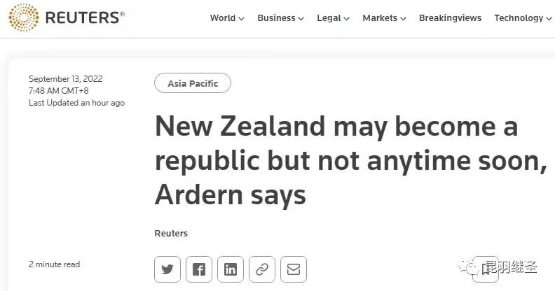继澳大利亚总理后,新西兰总理阿德恩在9月12日被问及相关话题时表示,君主制被抛弃是不可避免的,尽管短期内不会发生,但她相信新西兰将在其“有生之年”成为共和国。