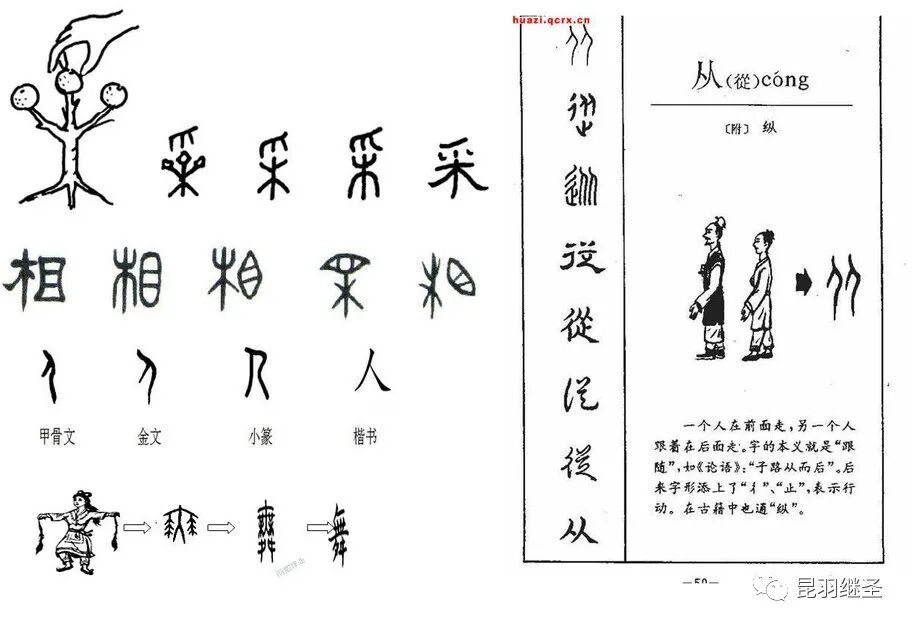 当“手”抽象成线条符号,放在木的上方,可以表意“采”;变成偏旁放在左边,可以表示与手有关的动作。同理,眼睛也是如此。眼睛抽象出来,放在木字旁边,就是“相”,左看右看,察看,判断的意思。