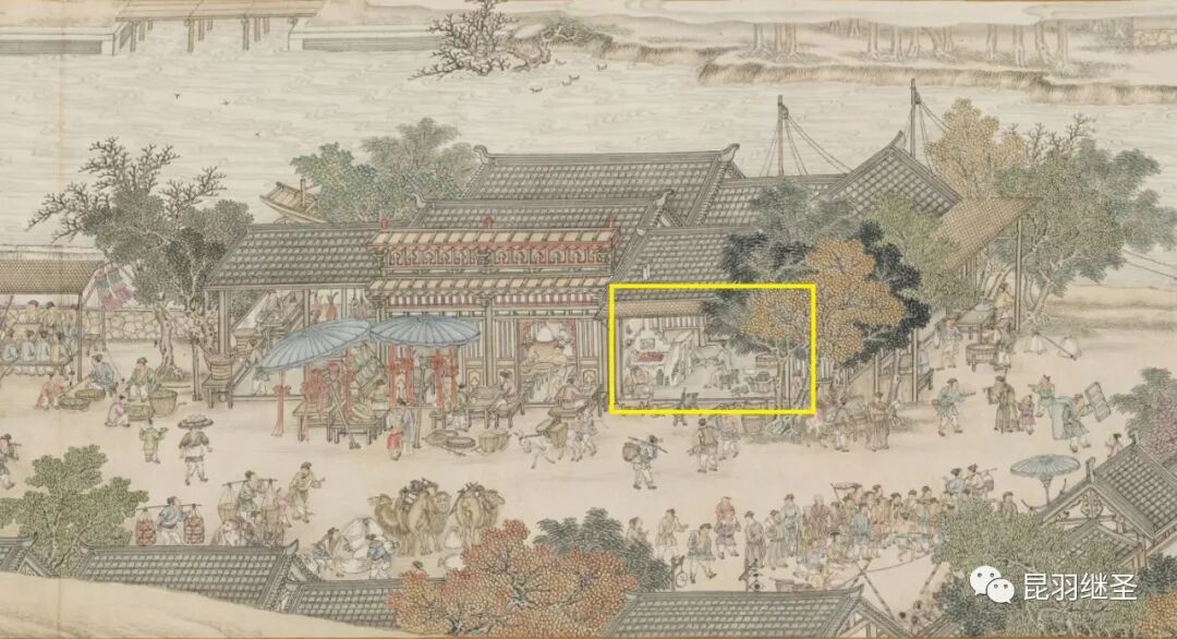 《仿宋院本金陵图卷》中有一个冶炼鼓风的器具,名曰“ 鞲(gōu)鞴( bài)”,上图放大后查看如下: