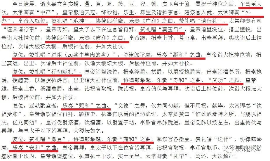 祭祀大典上,具体的交响曲目有广和、肃和、凝和、寿和、熙和、雍和之曲、安和之曲。