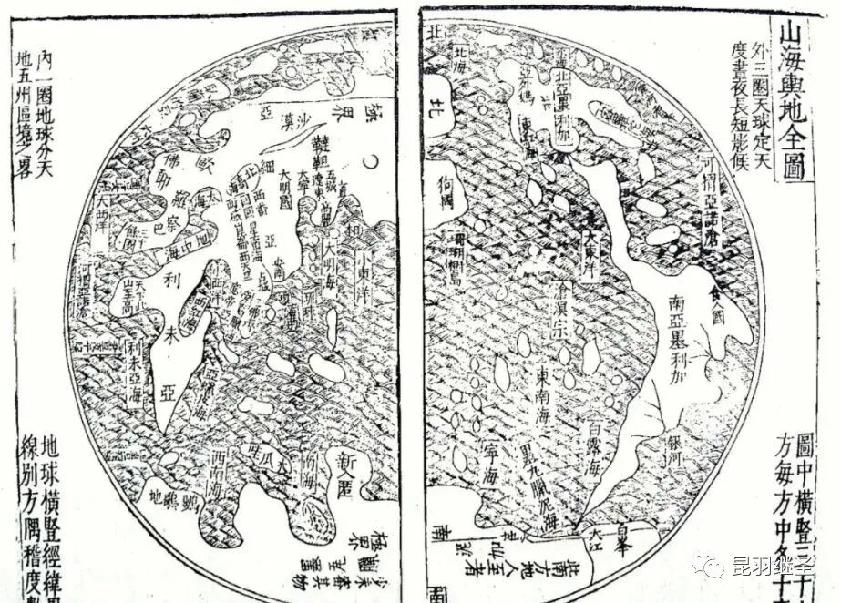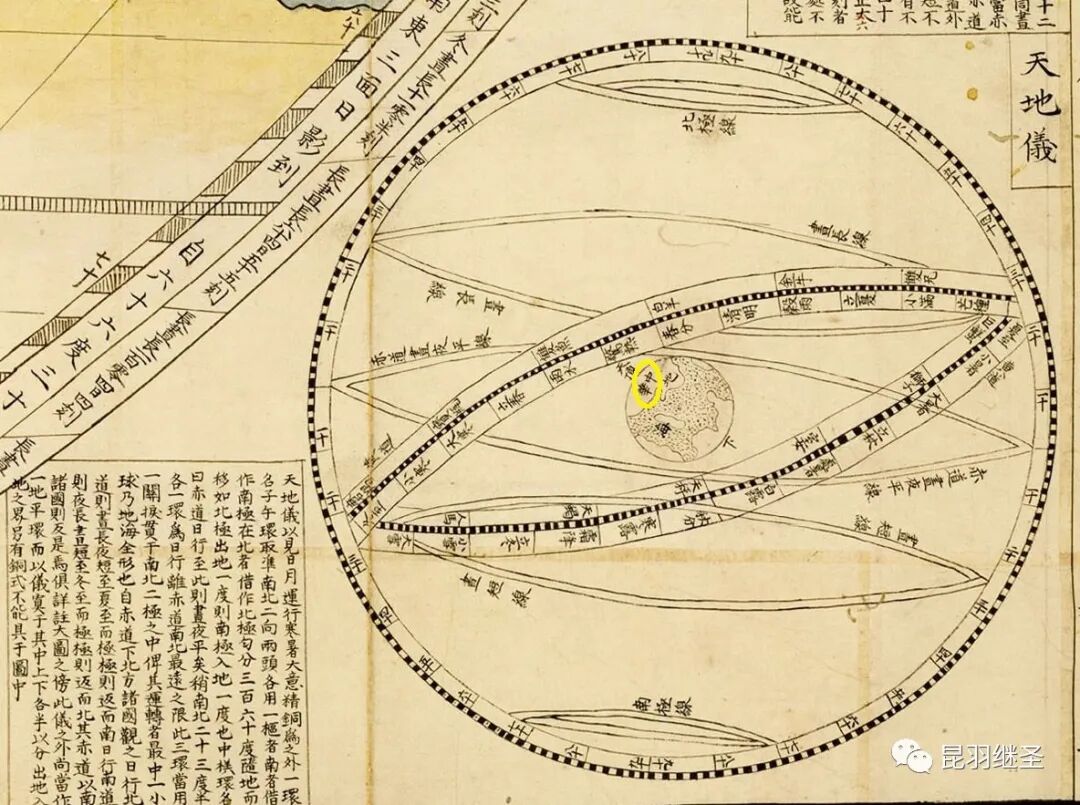 李之藻版本的坤图右下角有天地仪图,中间的那颗地球上,除了标注“地”、“海”外,只标了两字“中华”。果然是爱我中华。