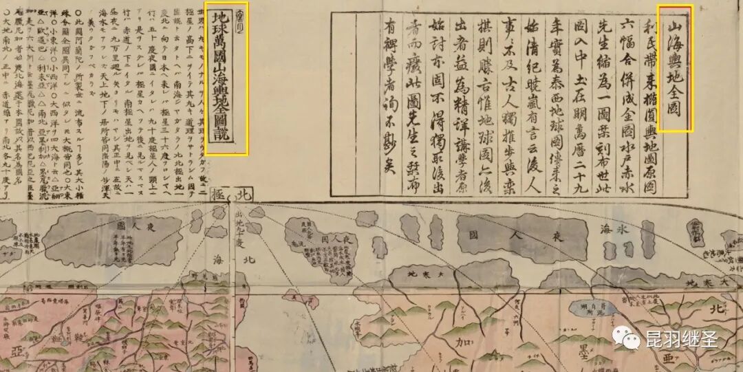 放大后可以清楚地看到右侧标注的名称是:山海舆地全图。小日子是根据中国流传过去的山海舆地全图绘制了此幅地图。