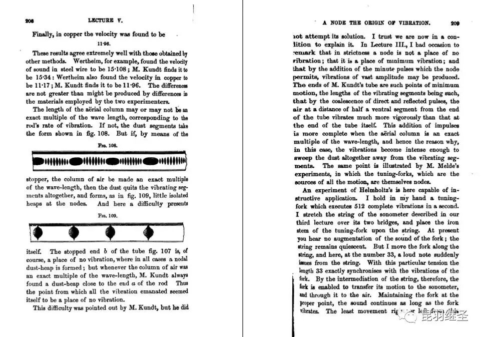 丁达尔在《声学》一书中对于管乐发生原理的讲解,书中给出的结论是,“In both stopped and open pipes the number of vibrations executed in a given time is inversely proportional to the length of the pipe”。