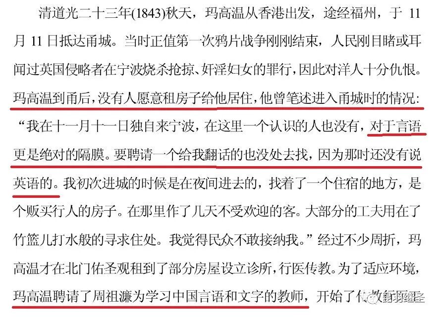 如图,1842年在启程来中国前,玛高温在纽约周礼大学医学院发表了题为“传教伟业中一声的职责”的演讲,提出把行医作为传教的有效手段,因为医生“立刻就能使疑虑重重的异教徒明显感觉到其使命的仁善,即便不大懂患者的语言,也能够做到这一点。否则,不懂他们的语言,福音牧师就啥也做不成。