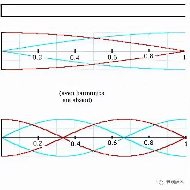 开口管(如长笛)和闭口管(如单簧管)发声原理的对比,其中蓝色曲线代表空气柱的振动,红色曲线代表管内的气压变化。