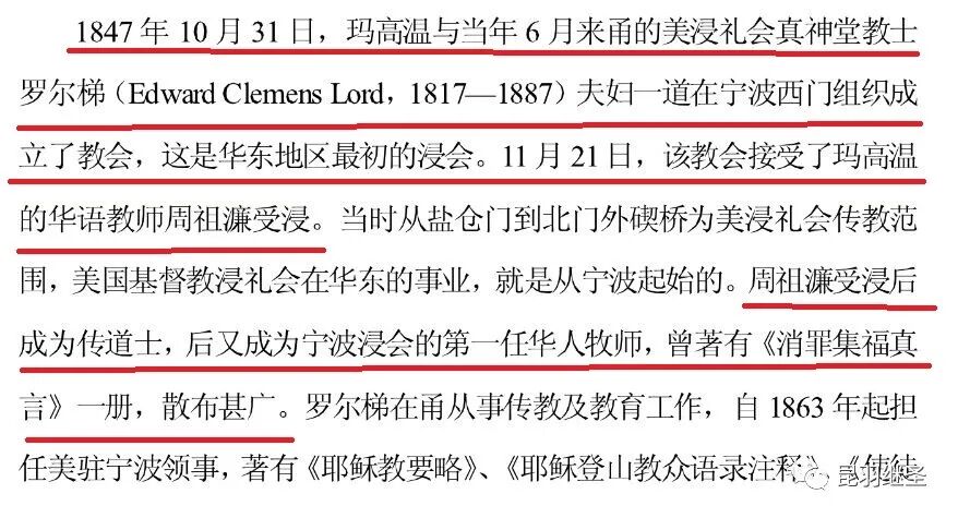 后来,玛高温好不容易找到一个只会一点点英文的周祖濂作为学习中国语言和文字的老师。1847年罗尔梯夫妇来宁波创办教会后,三个星期后,即同年11月21日,成功将周祖濂发展成为美国JD教新教之浸礼会教徒,如图所示。