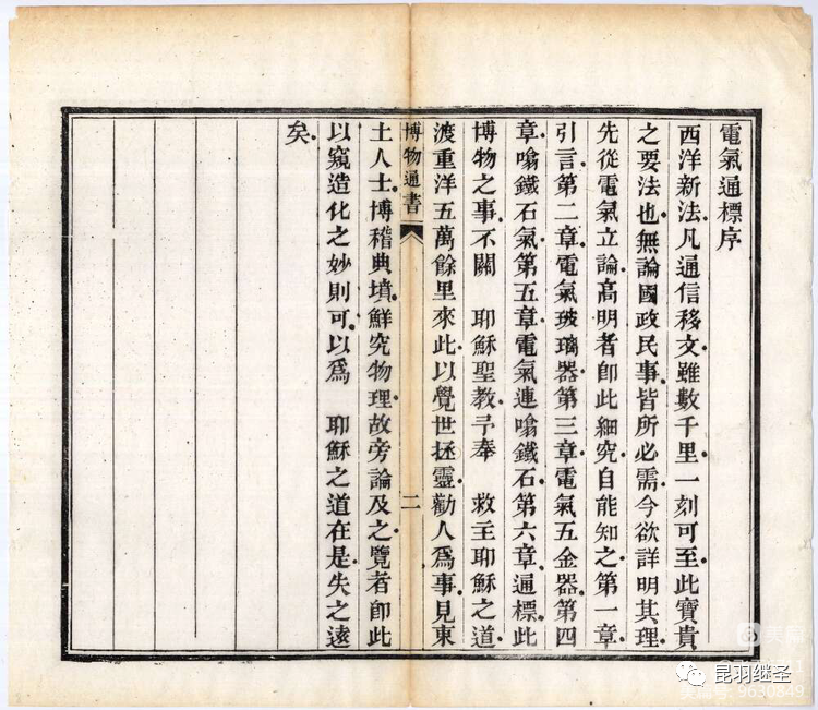 据考证,《博物通书》是华花圣经书房于1851年刊印的,该书又名《电气通标》。而且,有意思的是,华花圣经书房曾经将《博物通书》与《电气通标》并列,分别进行过刊印。