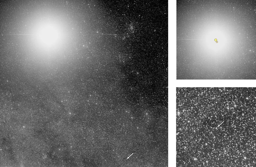 半人马座阿尔法星三体系统全家福(左)。右上为A星和B星,右下为比邻星。ESO