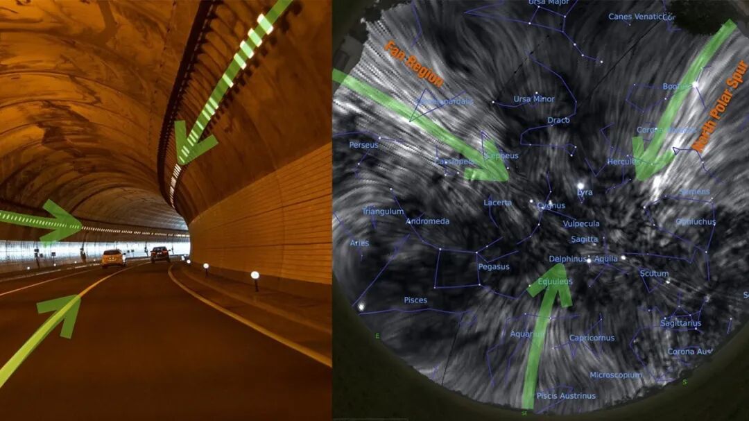 左图是一条普通的隧道。右图是偏振射电波天图。右图中的磁力纤维集合在一起,在宇宙中形成了一条类似于左图的磁力隧道。Dominion Radio Astrophysical Observatory / Villa Elisa telescope / ESA / Planck Collaboration / Stellarium / Jennifer West