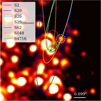 银心“S星团”部分恒星的轨道。黑色十字符号标注的是银心黑洞所在位置,亮绿色椭圆形为S4716的运行轨道。《天体物理学期刊》