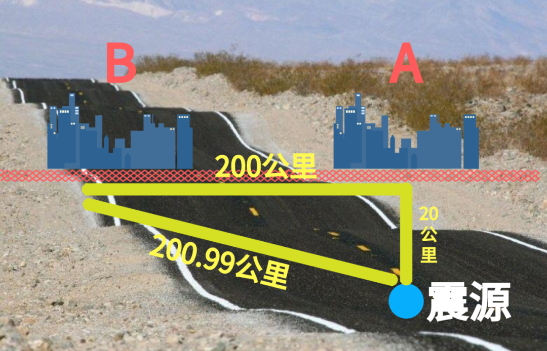 所以在地震发生后的第6秒,B城市就得到了预警信息。震源距A城市20公里,A城市距B城市200公里,根据勾股定理,震源距B城市约200.99公里,所以横波传递到B城市需要29秒,29减6,B城市能够在地震发生前23秒得到预警信息。