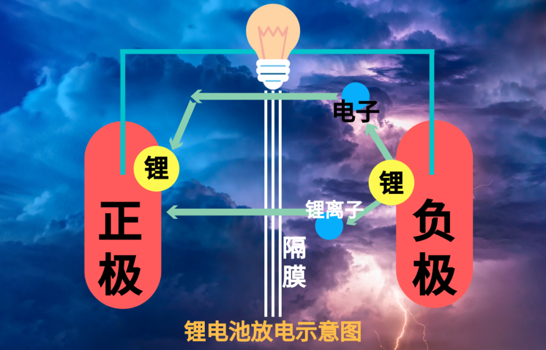 当我们需要用锂电池给用电器供电,同样也是用外电路将正负极相连并连接用电器,此时由于没有外接电源的刺激,锂离子无法留在负极,它会重新分解为锂离子和电子,锂离子透过隔膜回到正极,而电子则通过外电路前往正极,在这个过程中会经过用电器,为用电器提供电能,简单来讲就是锂原子由负极回到正极的过程,也就是我们俗称的放电。