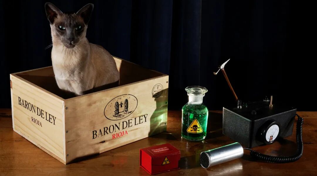 一只猫位于一个封闭的箱子里,箱子中有一个毒气瓶和一把受开关控制的锤子,而开关又由放射性元素控制,当放射性元素发生衰变则会触动开关,打碎瓶子,于是猫死亡,若放射性元素未衰变,则猫存活。