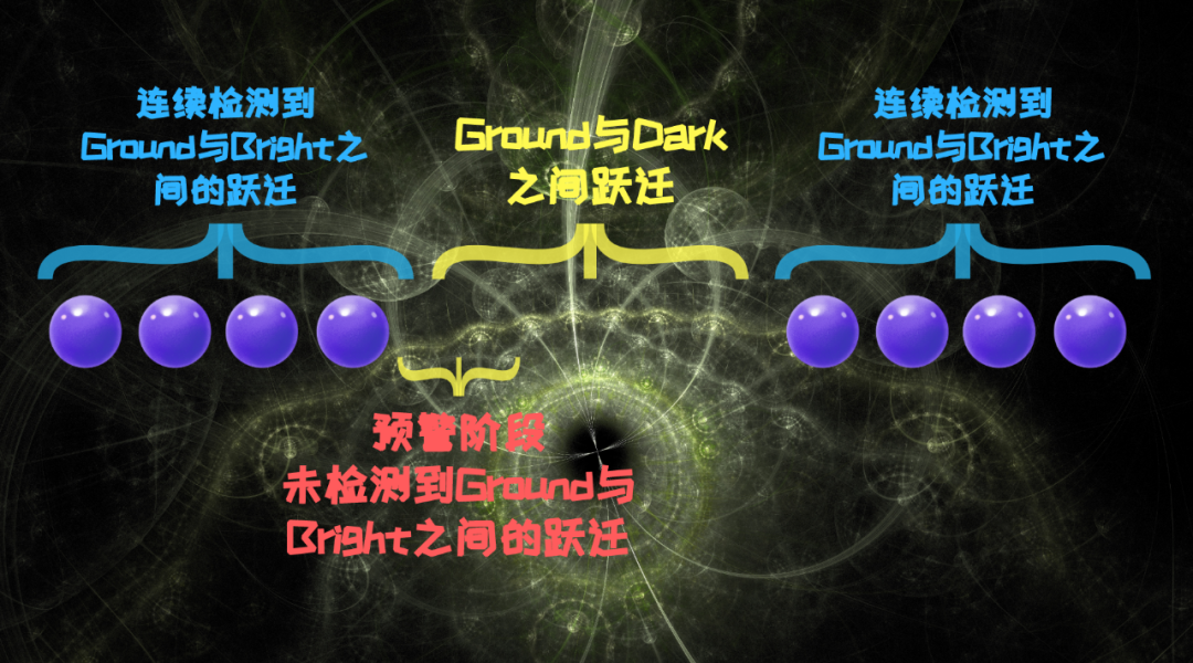 根据这个测量结果,我们可以预先判断电子是否将要在Ground与Dark之间发生跃迁,因为一旦Ground与Bright之间的跃迁相隔了一段时间没有再次发生,我们就可以知晓Ground与Dark之间的跃迁已经开始,而在之后一段时间之内,仍会是Ground与Dark之间的跃迁。