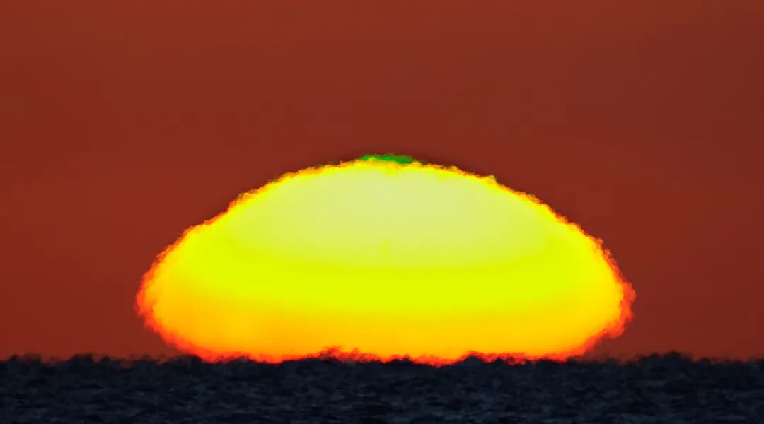 “绿闪”这种光学现象有两个关键点,一个是“绿”,表明了它的颜色,另一个则是“闪”,说明这种现象并不能长时间维持,它的出现通常是短暂的,短的时候只有一秒钟左右,而长的时候也不过数秒。相比生活在内陆城市的人们而言,在海边生活的人有更多的机会见到这种被称为“绿闪”的景观,这是因为在海上更容易满足“绿闪”形成的条件。那么,要形成“绿闪”,到底需要怎样的条件呢?罕见的绿闪现象到底是如何形成的呢?这我们还要从太阳光说起。平日里我们所说的“阳光”其实并不是太阳光的全部。