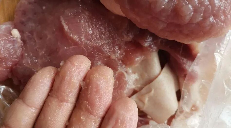 还有一种肉,也是颜色发白,但是没有发现明显渗水,肉质看起来还算紧密,这种肉更需要仔细甄别,因为这种肉可能没注水,但是用水洗过。那么问题来了,好好的肉为什么要用水洗呢?很可能是发生了轻微的腐坏。猪肉祖先开始腐坏的时候,表面并没有颜色的改变,而是开始发粘,这样的肉只凭眼睛看是很难分辨的,但如果上手去摸就会感觉粘粘的,而用水洗一下,就不粘了。